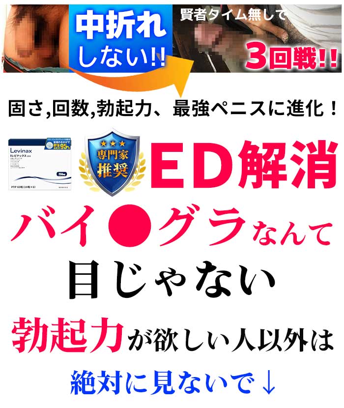 「もう“ゴム付けるのが面倒”なんて言えない硬さ」ずっと通ってるデリヘル嬢に「最近ちょっと元気ないですね」って 言われたのがショックで、レビナックスを試した。 結果、中で動かしてても萎えないし、「えっ、今日マジでバイ●グラ使ってないんですか?」って言われた(笑)